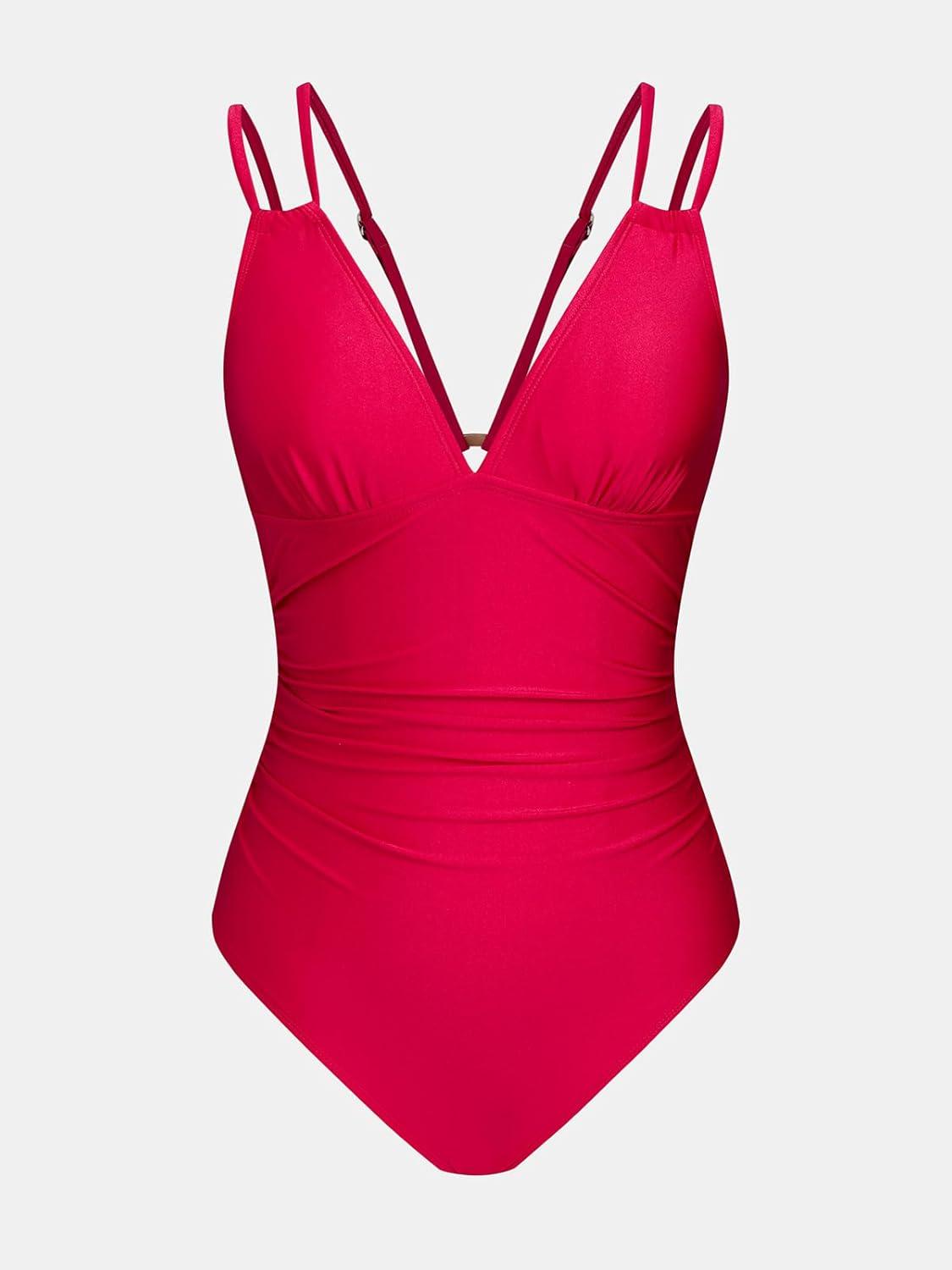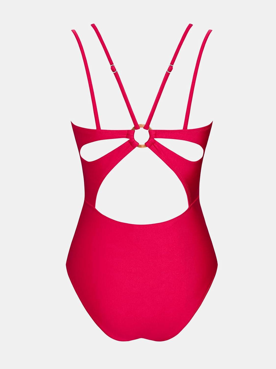CUPSHE Women’s One Piece Swimsuit V Neck Tummy Control Double Adjustable Straps Back Cutout O-Ring(Raspberry Red)