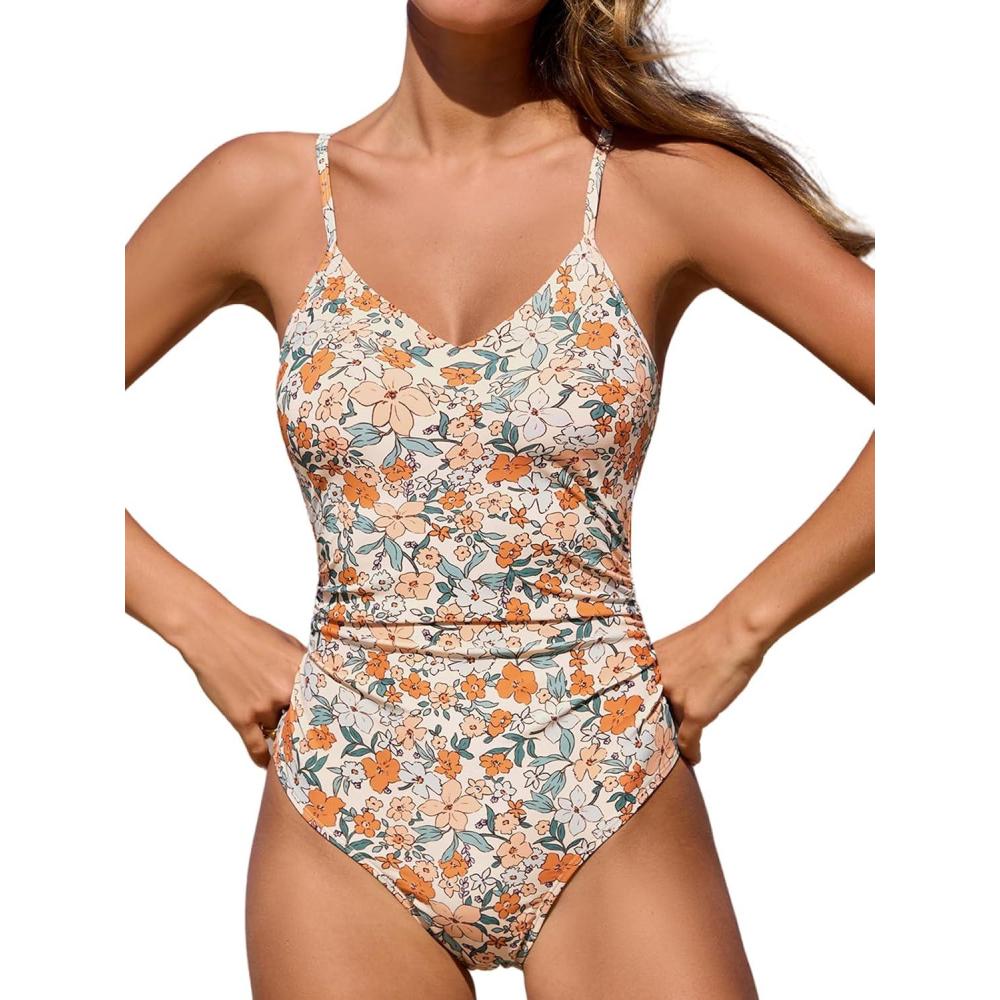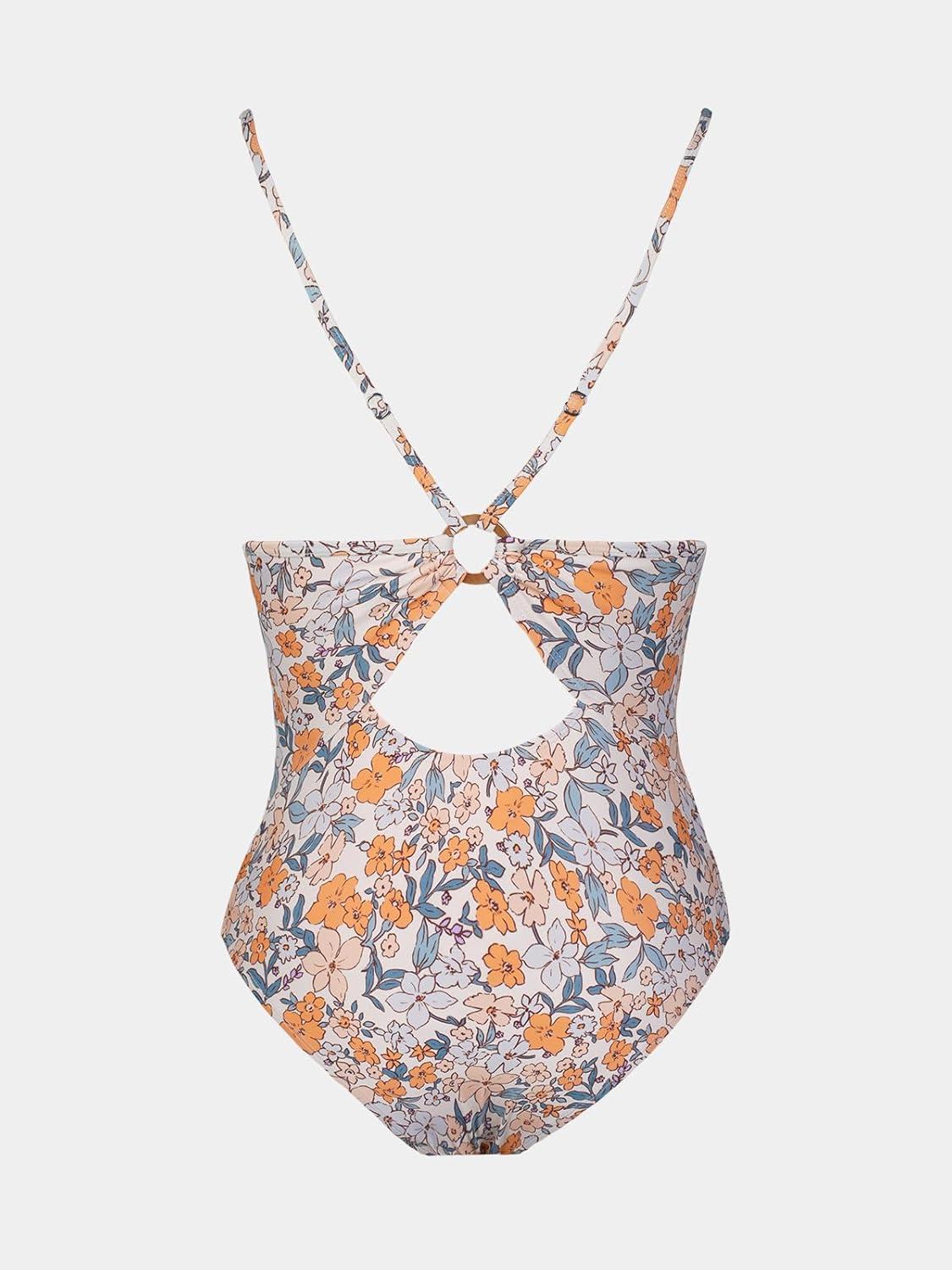 CUPSHE Women’s One Piece Swimsuits Bathing Suits Cutout V Neck Tummy Control Adjustable Straps O Ring(Beige/Floral)
