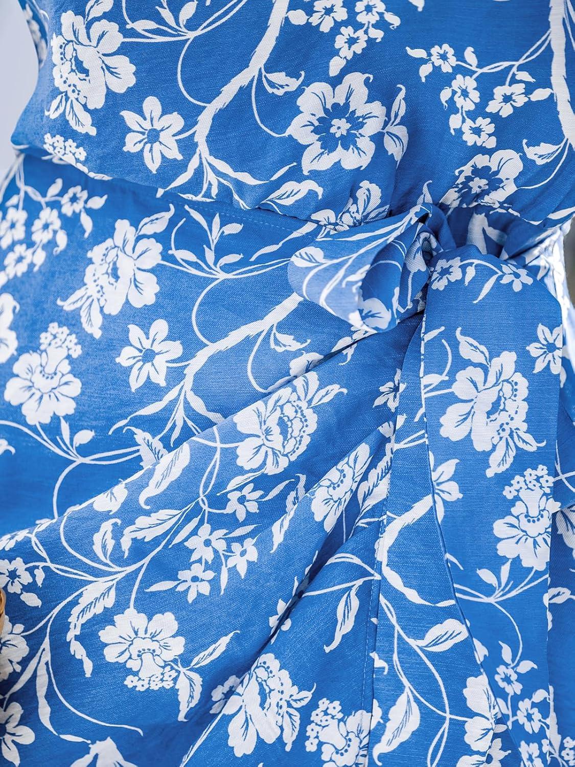 CUPSHE Women’s One Shoulder Leaf Print Self-tie Short Dress Sleeveless Tiered Hem Formal Dress Casual Mini Dress(Blue)