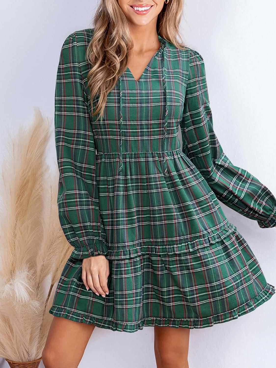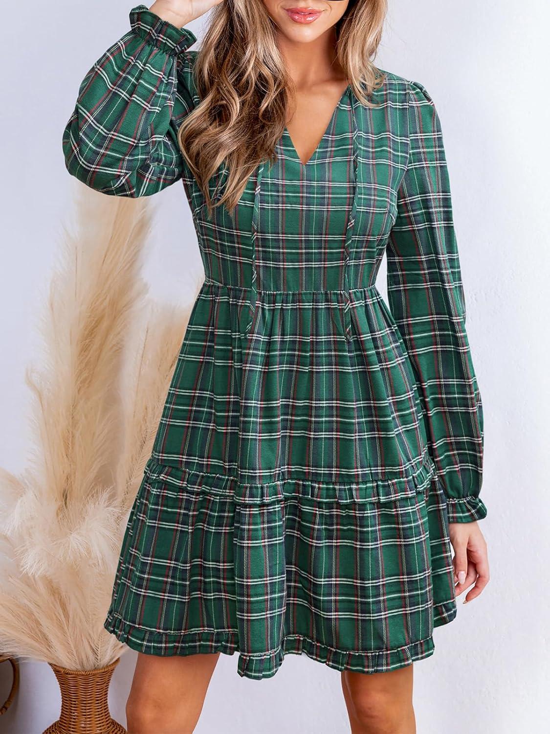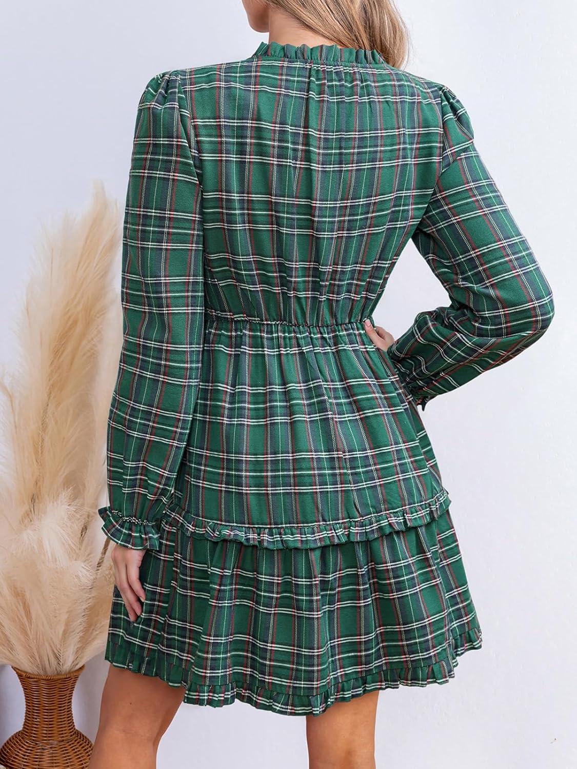 CUPSHE Women’s Plaid Fall Ruffle Mini Dress V Neck Puff Sleeve Casual Autumn Party Dresses(Green)