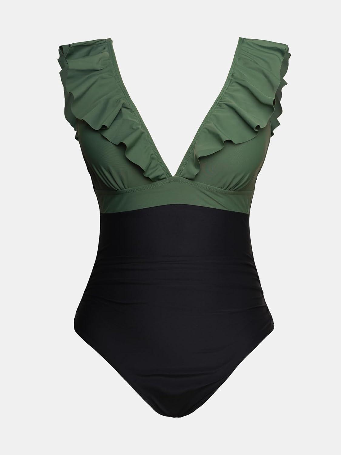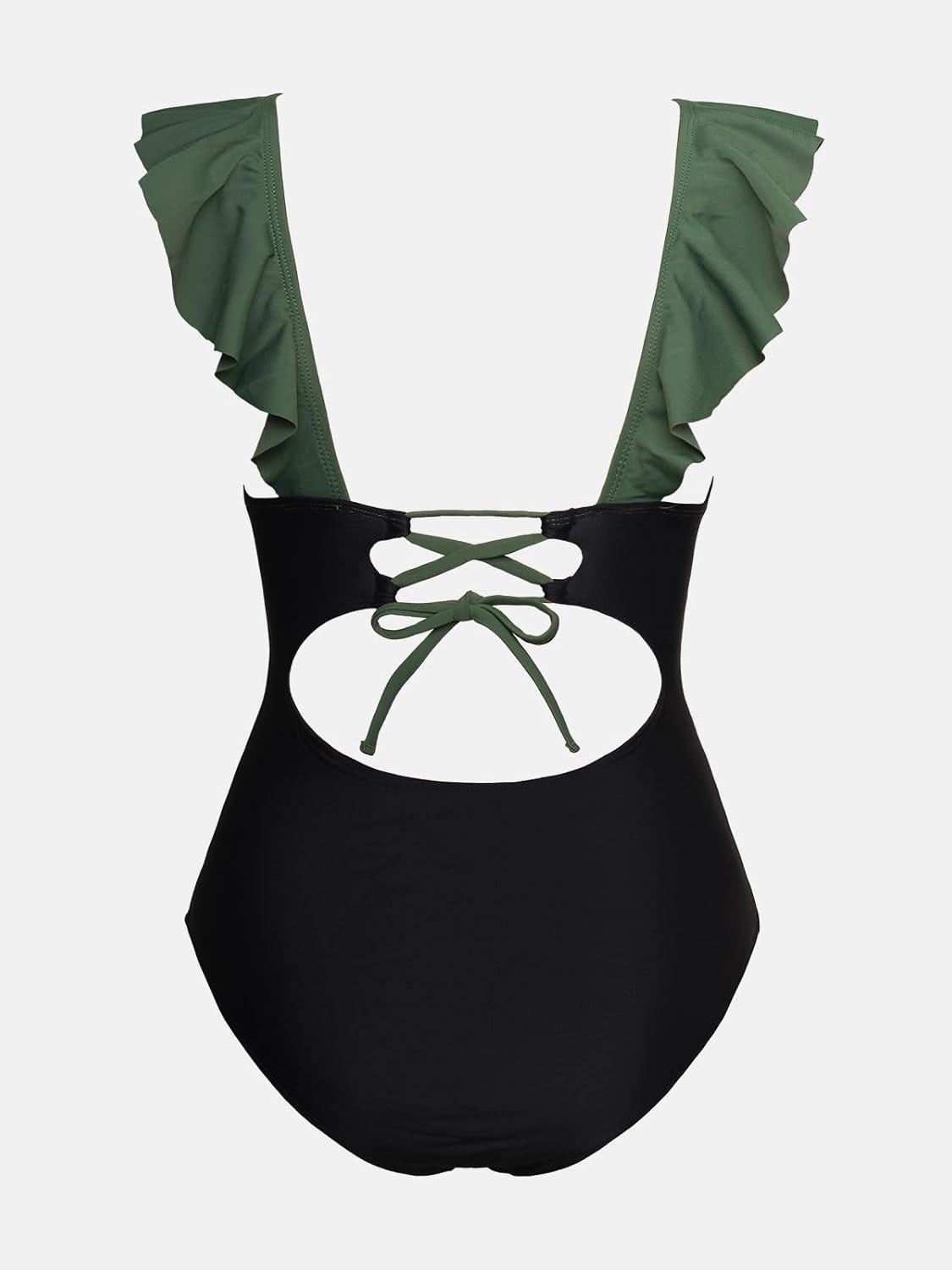CUPSHE Women’s Ruffled One Piece Swimsuit V Neck Lace Up(Forest Green/Black)