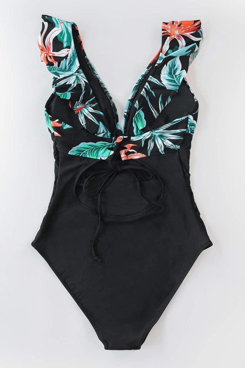 CUPSHE Women’s Ruffled One Piece Swimsuit V Neck Lace Up(Tropical Flower Print)