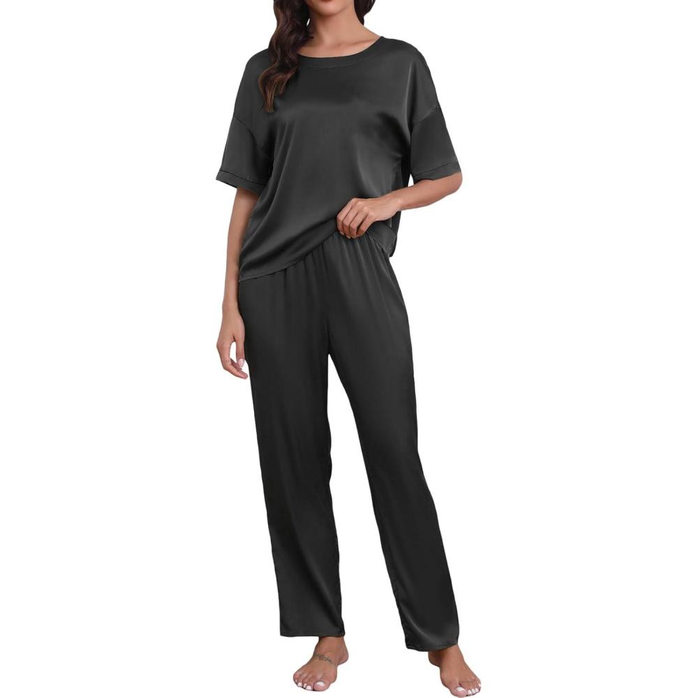 CUPSHE Womens Satin Silk Pajama Set Soft Pjs Sleepwear Short Sleeve Top with Long Pajama Pant Set(B-black)