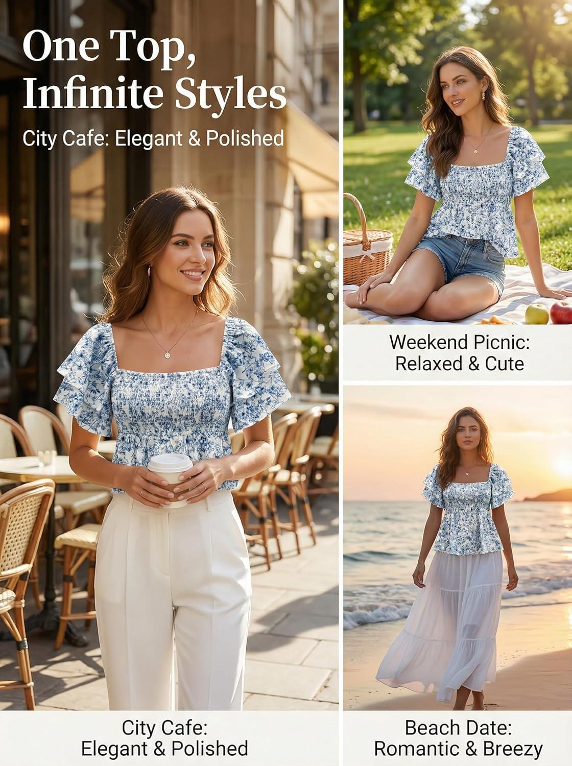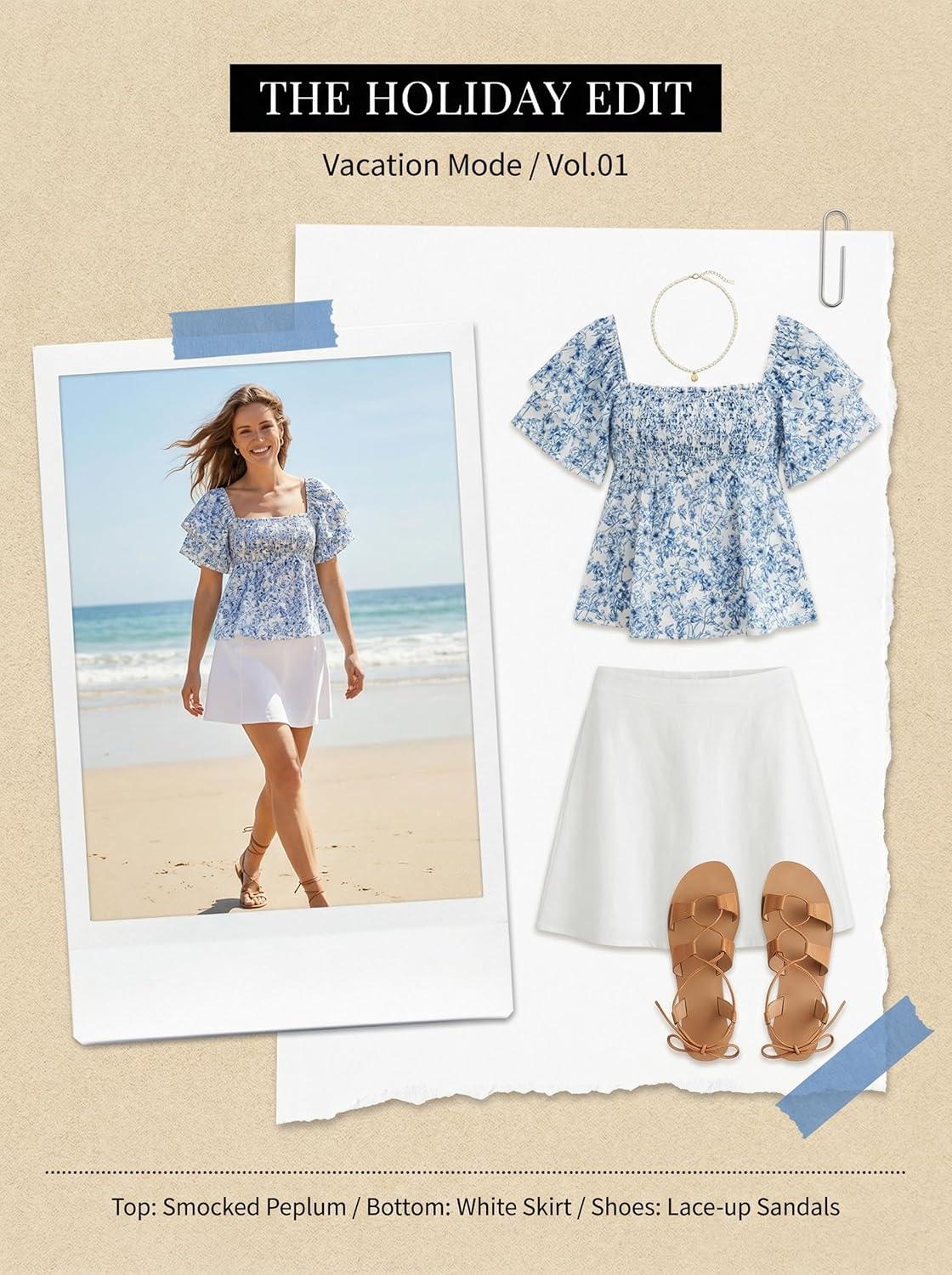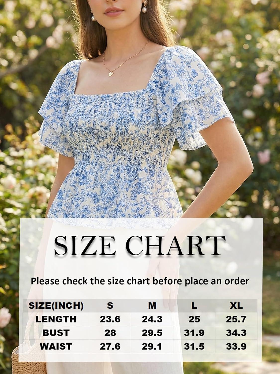 CUPSHE Women’s Square Neck Smocked Peplum Top Ruffle Short Sleeve Babydoll Shirred Blouse(Blue)