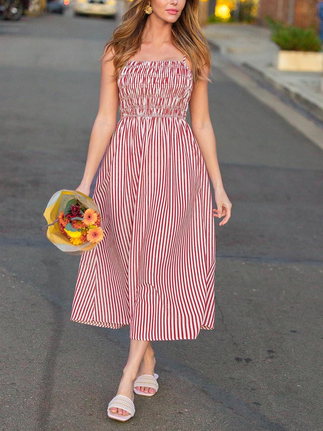 CUPSHE Women’s Striped Smocked Maxi Dress Spaghetti Strap Flowy Sundress Beach Vacation Summer Long Dresses(Red White)