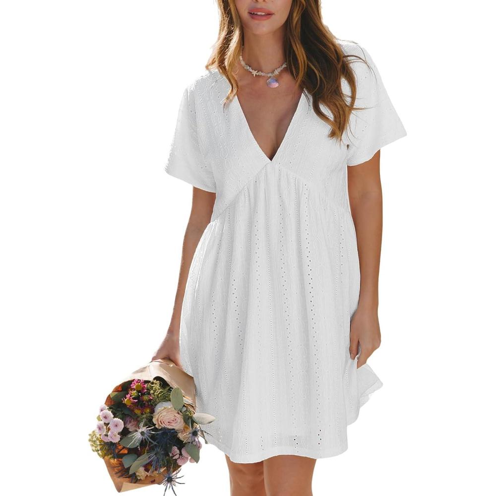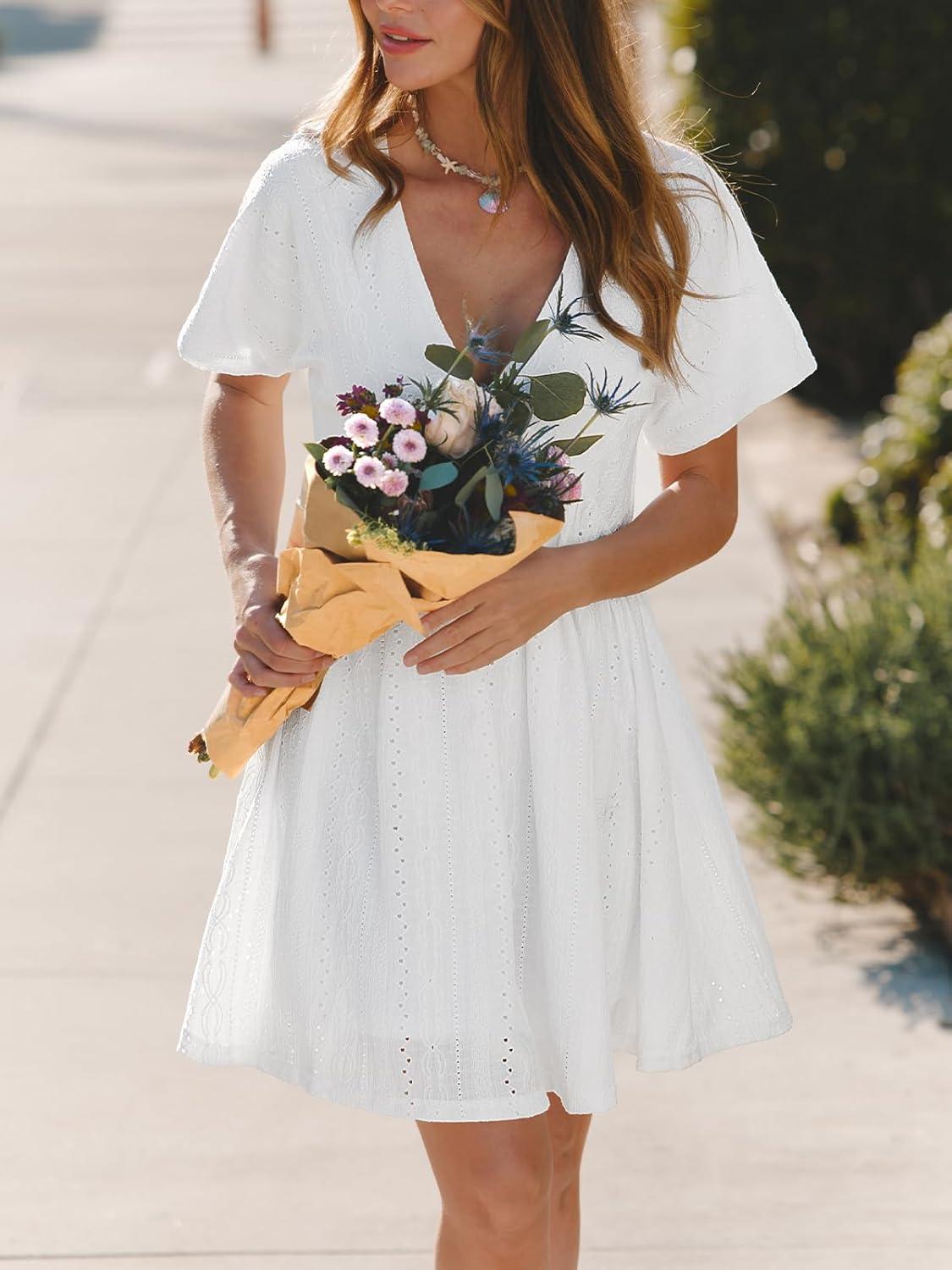 CUPSHE Women’s Summer Dresses V Neck Short Sleeve Hollow Out Ruffle Tunic Double Layer Vacation Mini Dress(White)