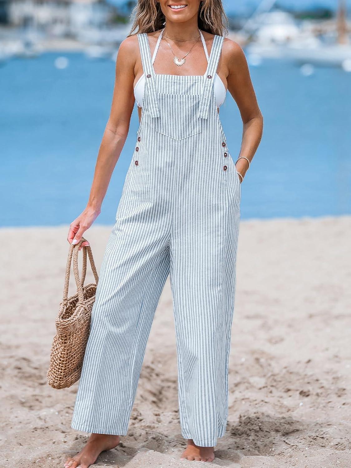 CUPSHE Women’s Summer Jumpsuits Striped Wide Leg Overall Casual Straps Button Loose Maxi Rompers with Pockets(Blue Striped)