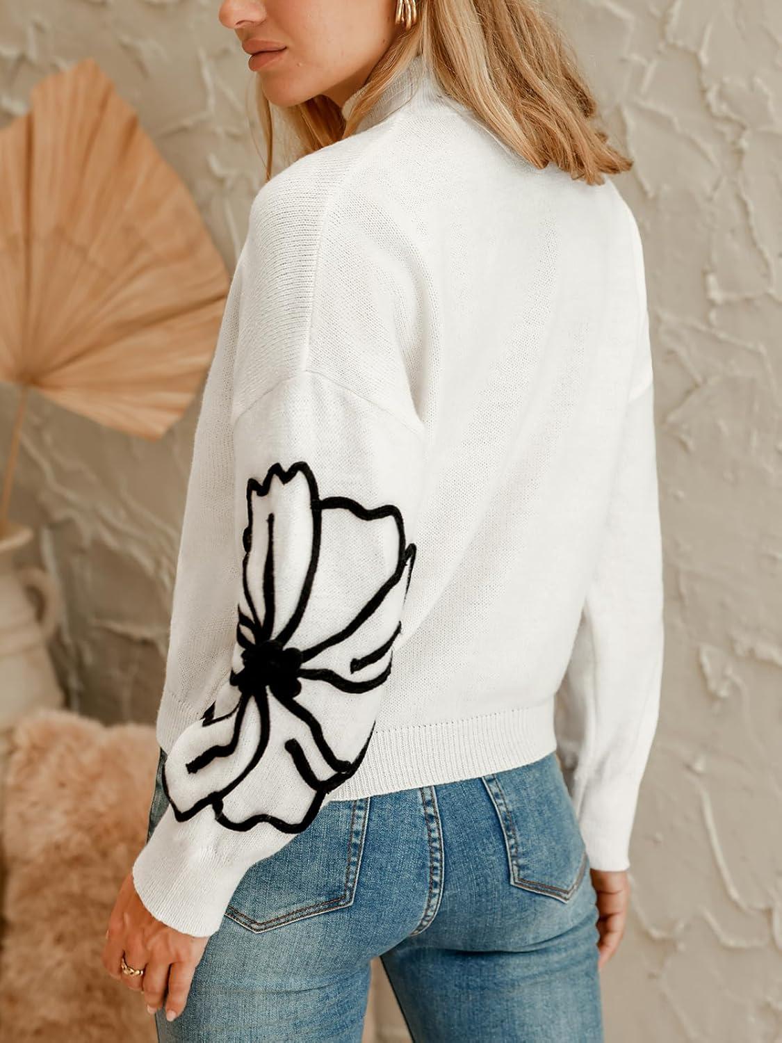 CUPSHE Womens Sweaters Mock Neck Long Sleeve Sweater Floral Lightweight Knit Pullover Sweater Tops Tops(White)
