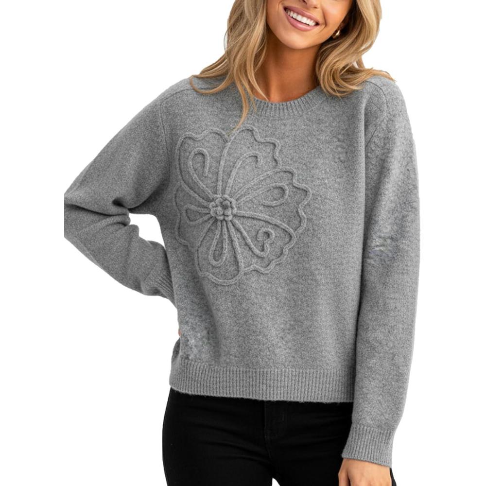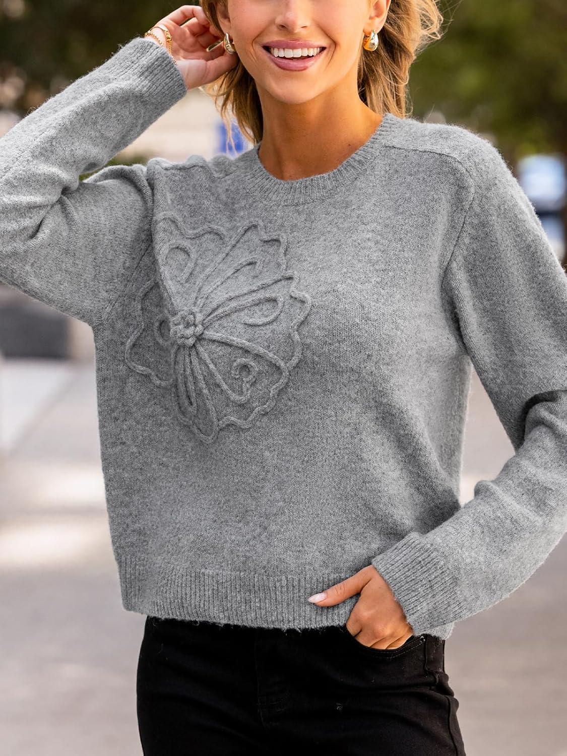 CUPSHE Women’s Sweaters Soft Knit Pullover Fall Sweaters 3D Floral Long Sleeve Crewneck Ribbed Casual Top(Gray)