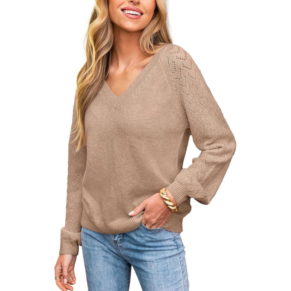 CUPSHE Womens Sweaters V Neck Long Sleeve Lightweight Soft Crochet Casual Pullover Sweater Tops(B-apricot)