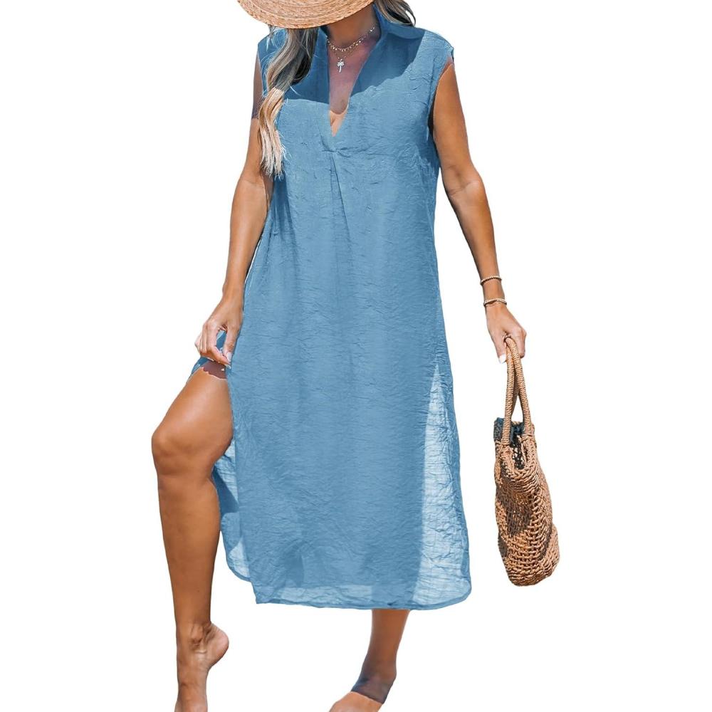 CUPSHE Women’s Swimsuit Coverup Casual Sleeveless Side Split Long Cardigans V Neck Midi Beach Dress(Grey Blue)