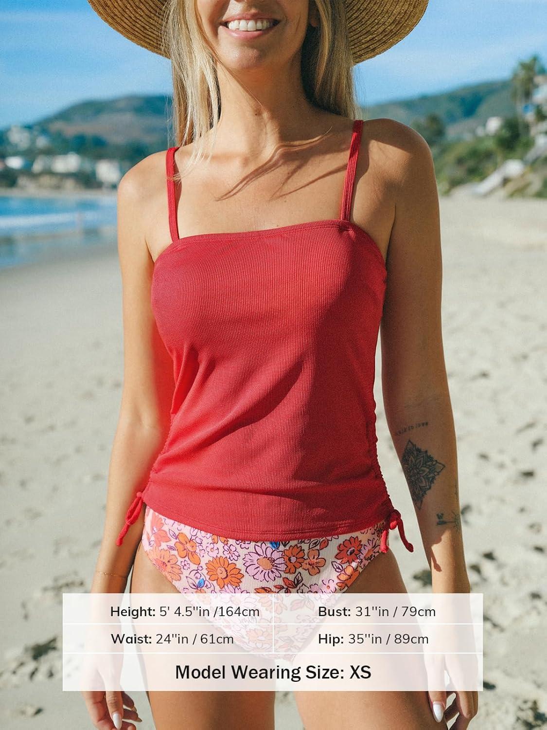 CUPSHE Women’s Tankini Set Two Piece Swimsuit Ruched Drawstring Bathing Suits with High Waisted Bottom Rib(Red Floral)