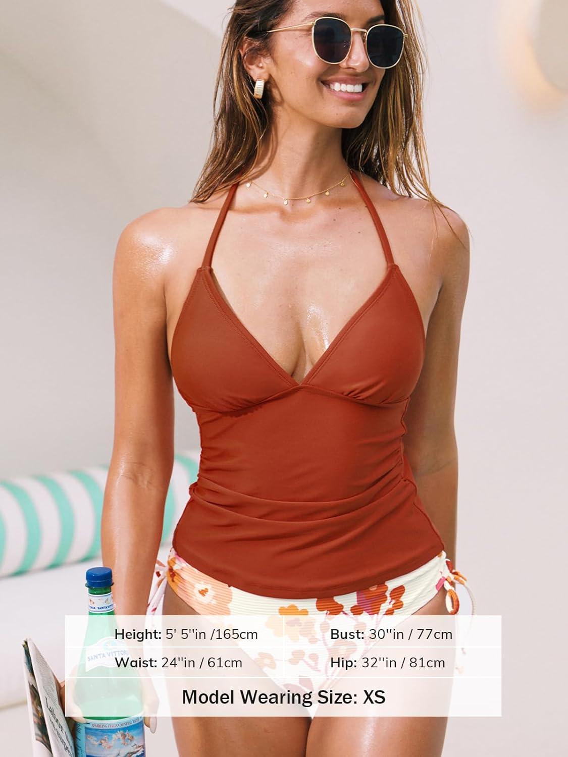 CUPSHE Women’s Tankini Sets Halter V Neck Ruched Two Piece Swimsuit Mid Rise Adjustable Strappy Swimwear(Caramel/Floral)