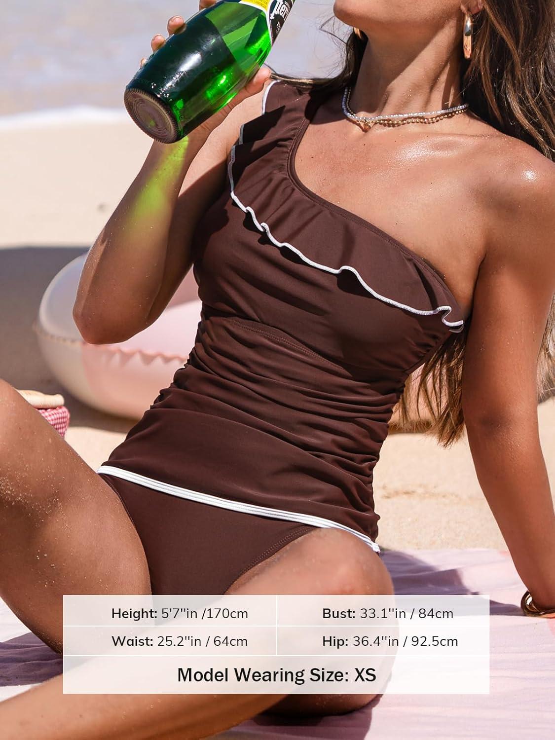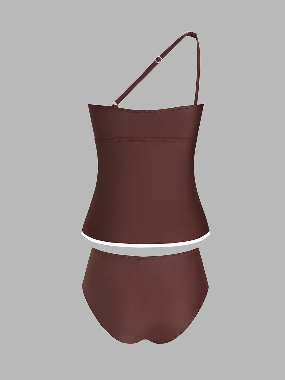 CUPSHE Women’s Tankini Sets One Shoulder Neck Asymmetrical Ruffles Two Piece Swimsuit Adjustable Straps Swimwear(Reddish Brown)