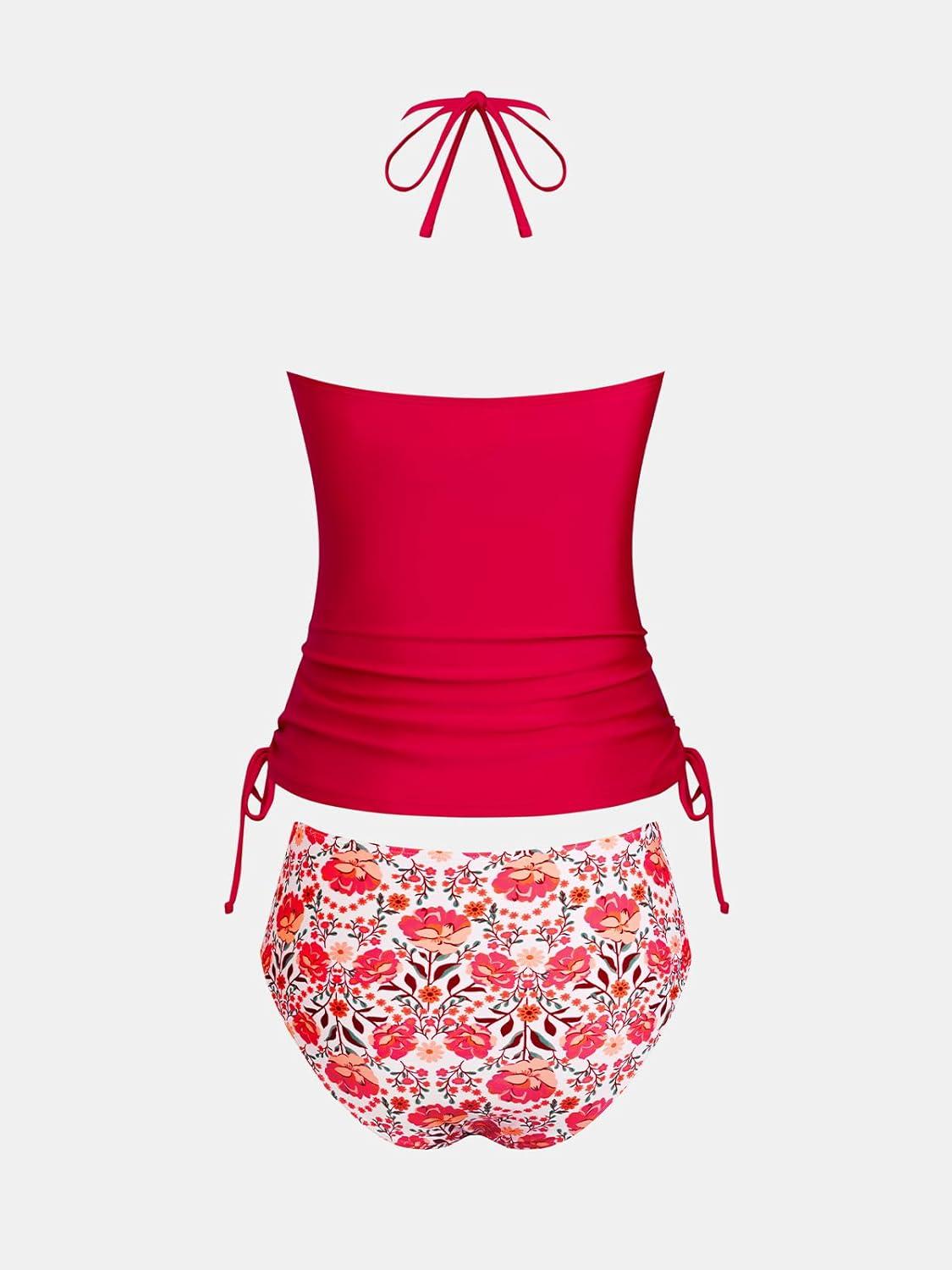 CUPSHE Women’s Tankini Sets Two Piece Swimsuit High Neck Halter Mid Rise Adjustable Drawstrings(True Red/Floral)