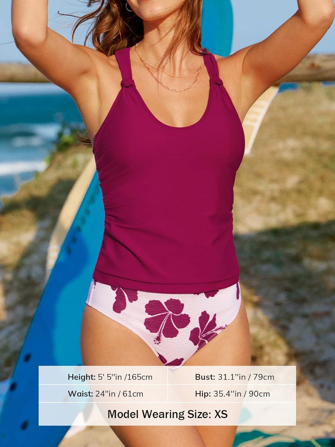 CUPSHE Women’s Tankini Sets Two Piece Swimsuit Mid Rise Bathing Suit Crossback Tie Tummy Control Textured(Berry White Floral)