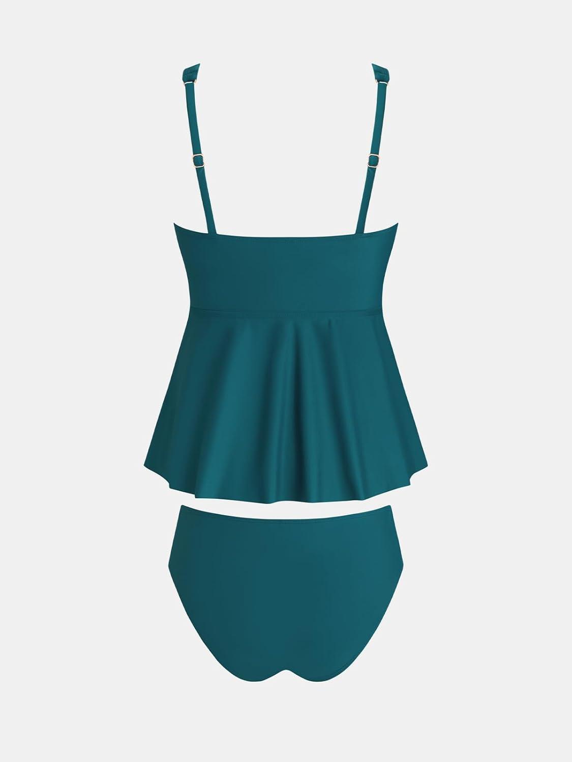 CUPSHE Women’s Tankini Sets Two Piece Swimsuit V Neck V Wire Bathing Suit Ruched Tummy Flowy Hem Mid Rise(Dark Teal Blue)