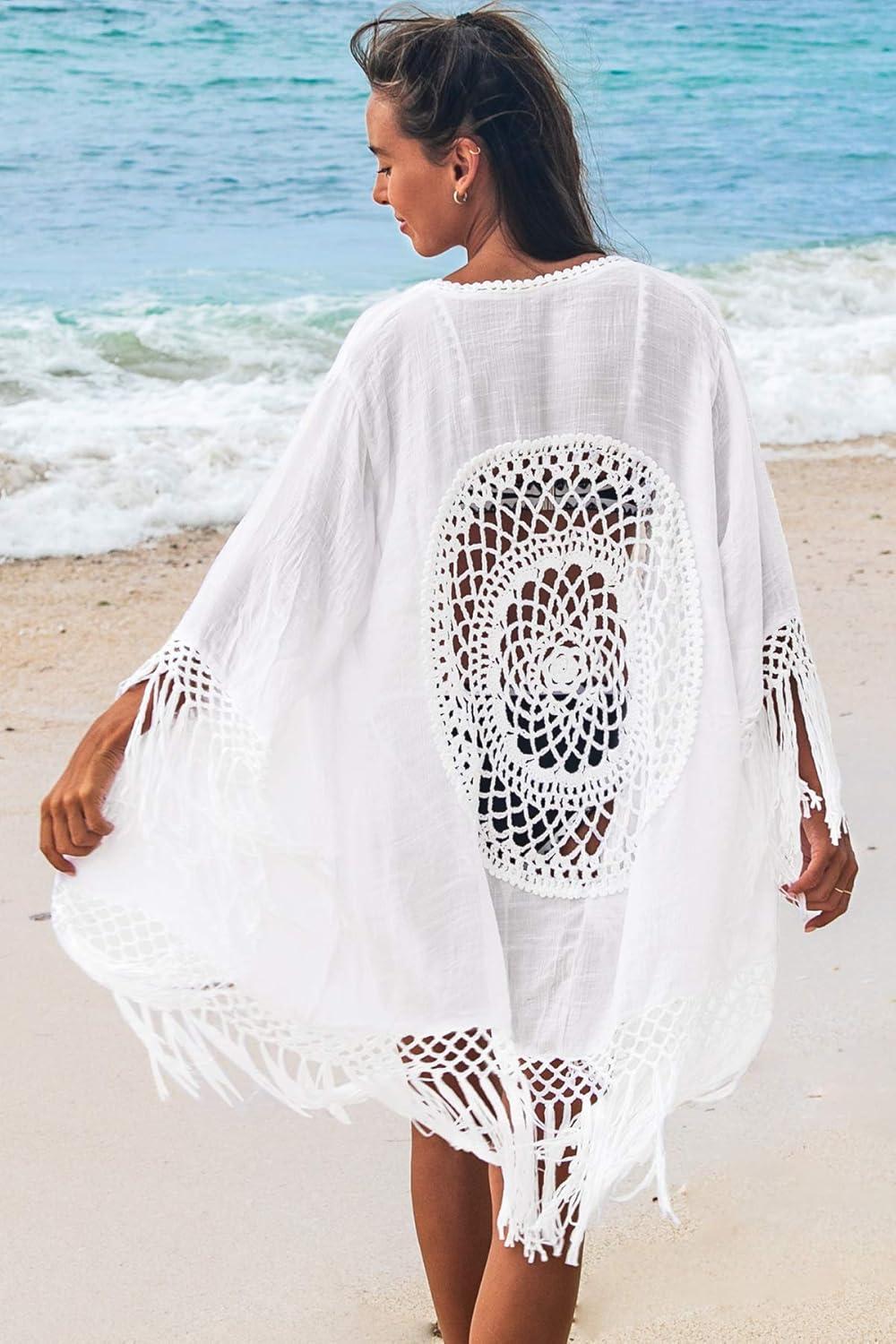 CUPSHE Women’s Tassel Long Kimono Cardigans Beach Swimsuit Bikini Cover Up(White)