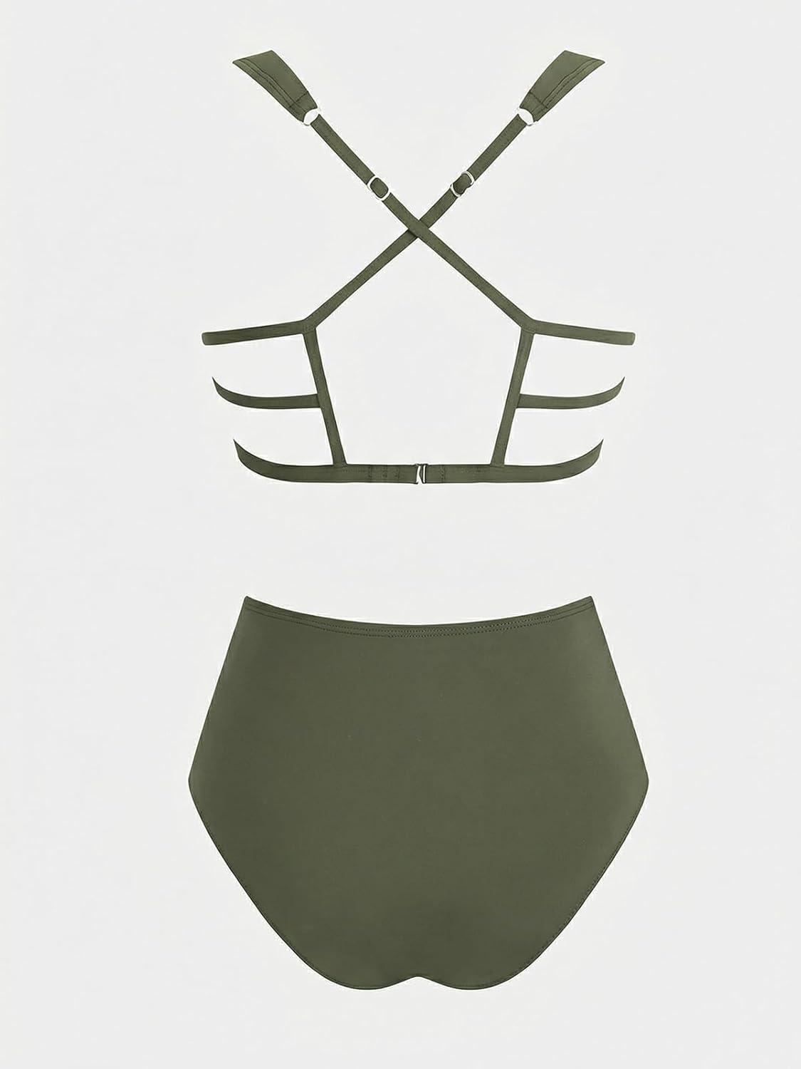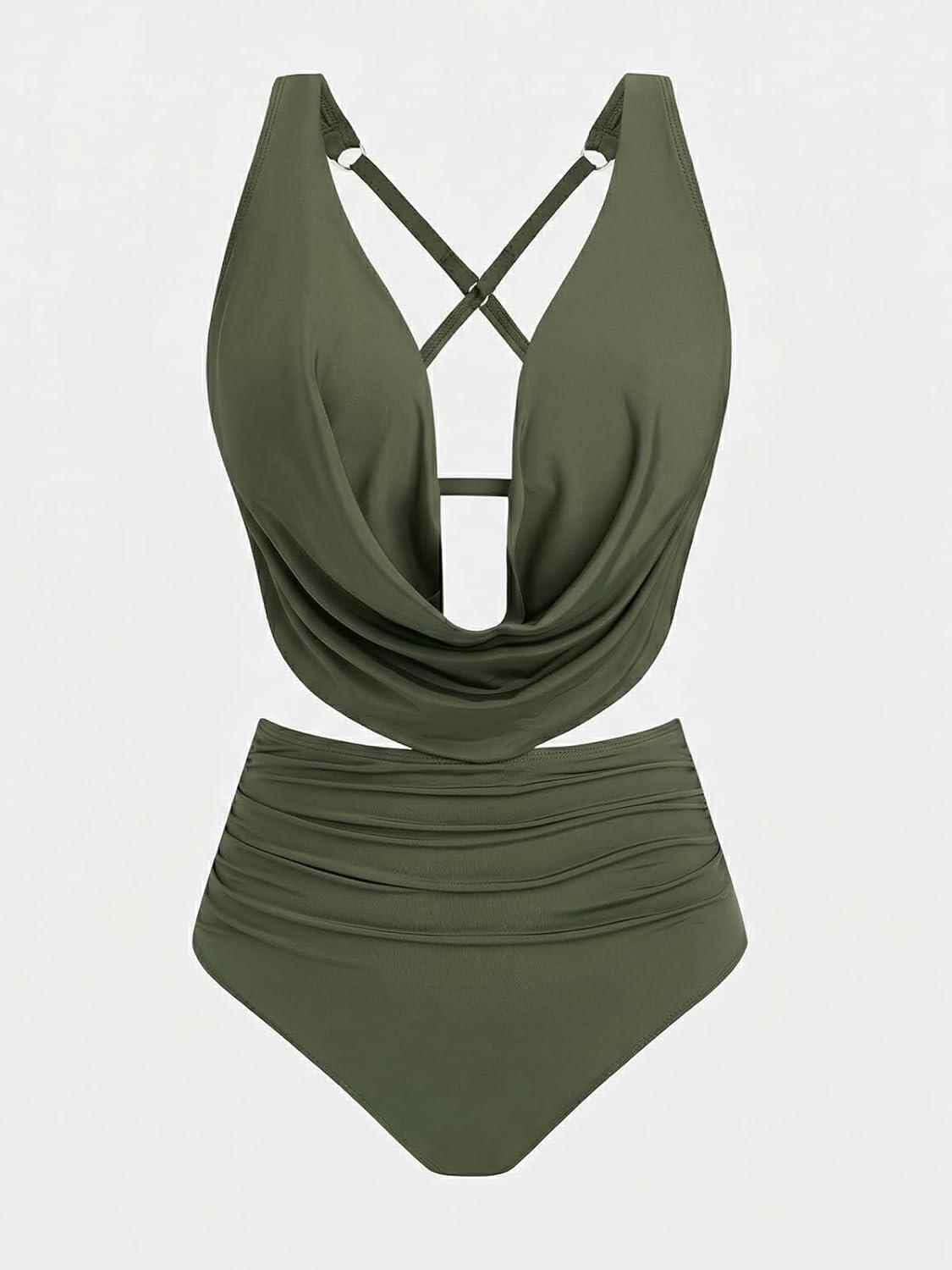 CUPSHE Women’s Two Piece Bikini Sets High Waisted Deep V Cowl Neck Ruching Crisscross Back Hook Adjustable Straps(Army Green)