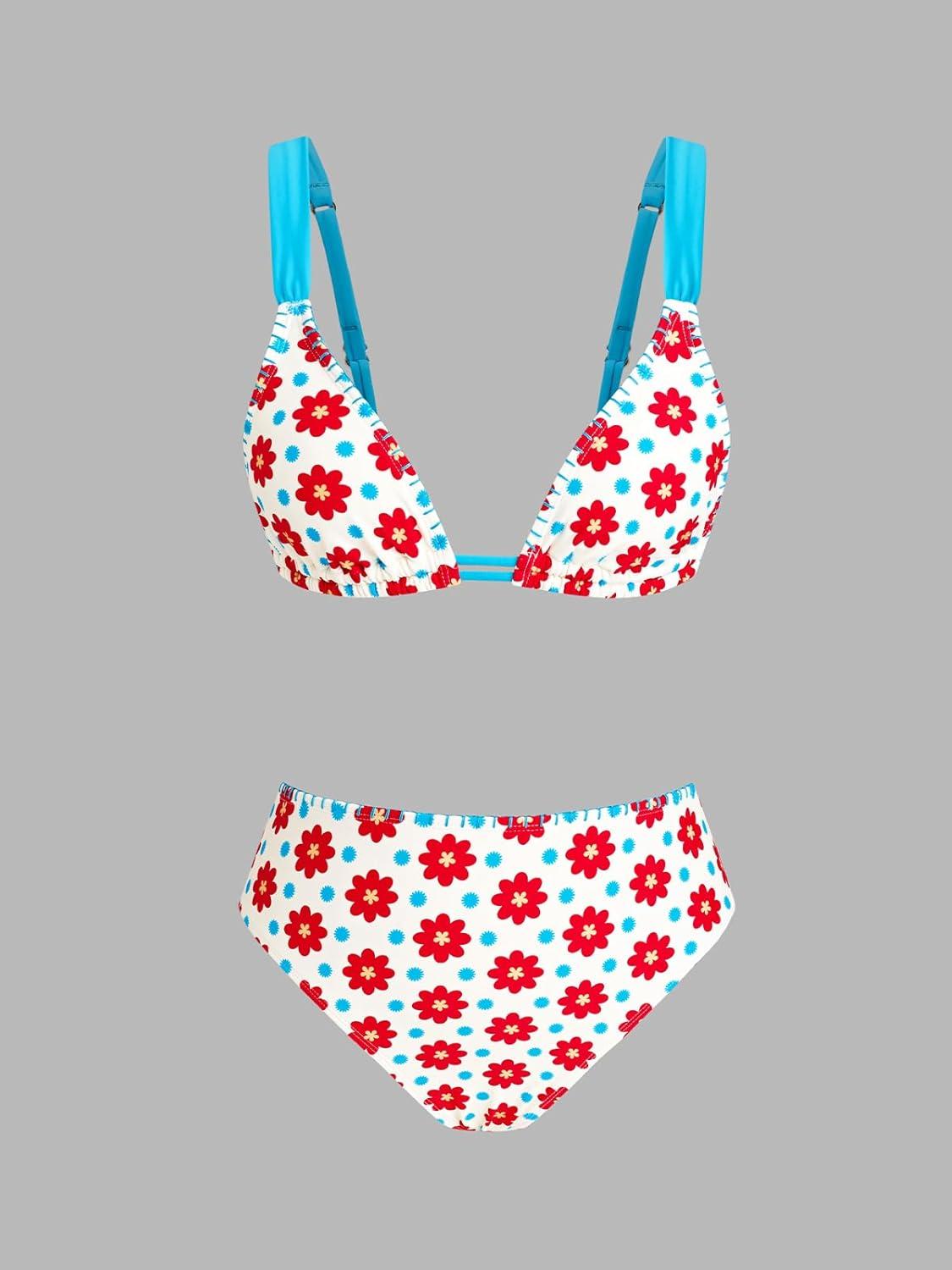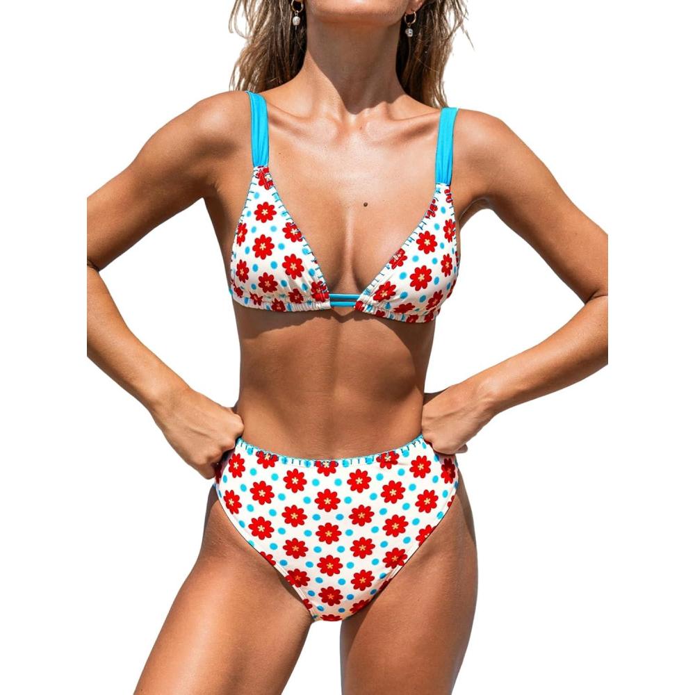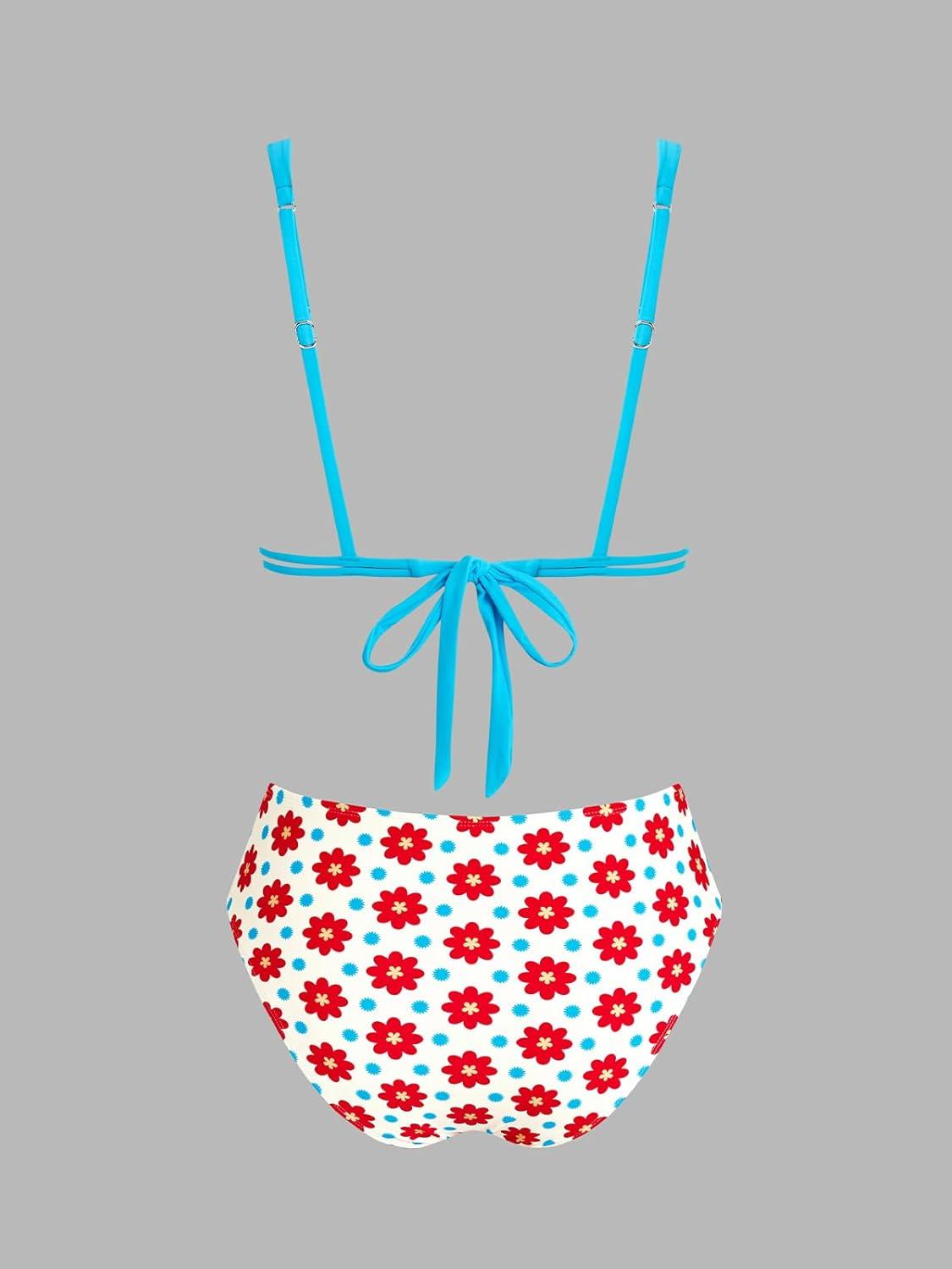 CUPSHE Women’s Two Piece Bikini Sets High Waisted V Neck Bathing Suits Stitching Back Self Tie Wide Adjustable Straps(Blue/Red Floral)