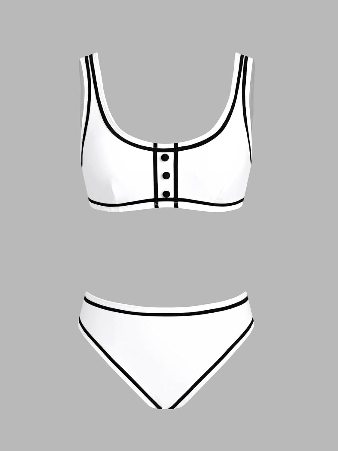CUPSHE Women’s Two Piece Bikini Sets Scoop Neck Bathing Suits Color Block Button Wide Straps Mide Rise Swimwear(White/Black)