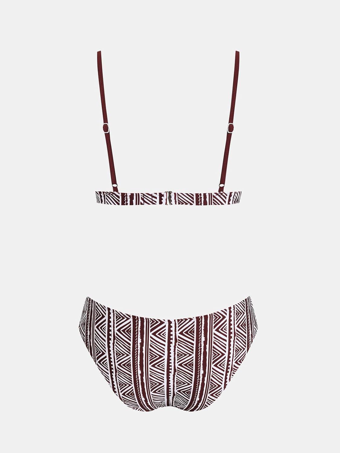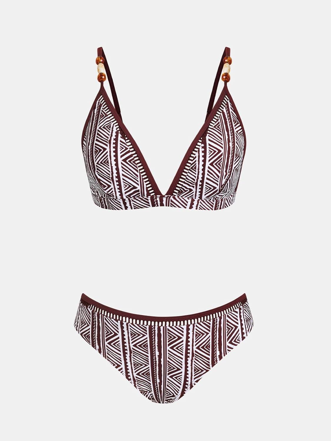 CUPSHE Women’s Two Piece Bikini Sets V Neck Bathing Suits Ladder Trim Back Hook Adjustable Straps(Brown Geo)