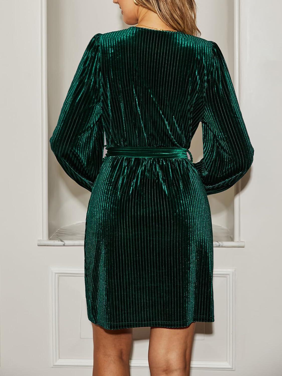 CUPSHE Women’s Winter Velvet Long Sleeve Wrap Dress Semi Formal Belted Tie V Neck Cocktail Mini Dress(Green)